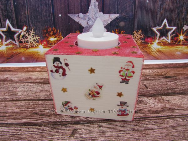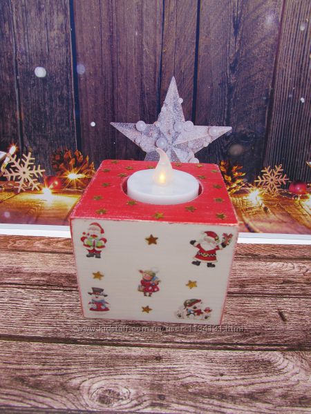Подсвечник из массива сосны,декорирован в технике вживления картинки и трафаретной росписью.Подсвечник украшен маленькими золотыми звездочками,которые при горении свечи сверкают.Для тепла и уюта в доме ,зажигайте свечи!Сделайте новогоднюю ночь с любимыми и родными людьми- не забываемой!
