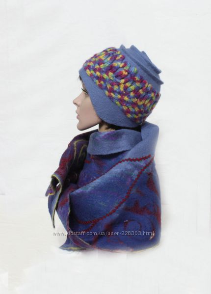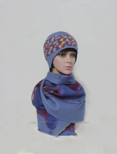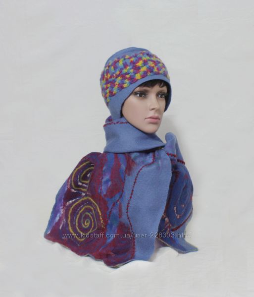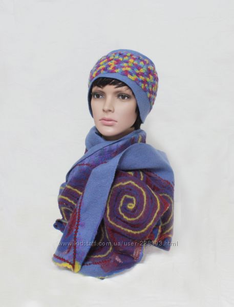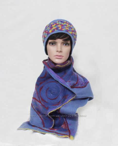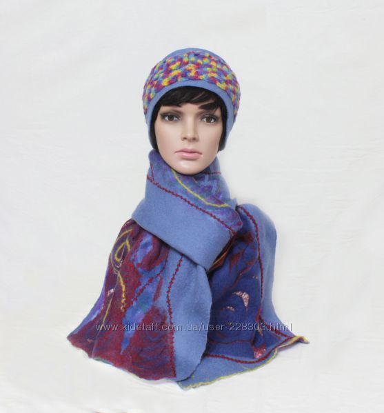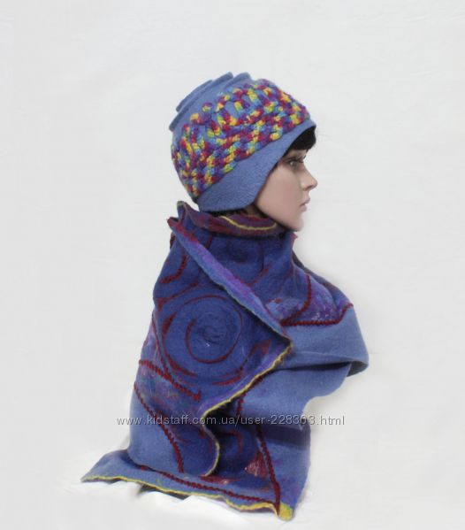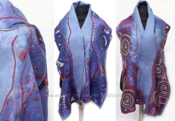 Шарф в комплекте ′Катарина′ – это слияние двух половинок : – классической шерстяной ( теплой и не продуваемой) и нуно фелтинг – рисунок шерстью на полупрозрачном хлопке ( воздушной и пластичной); декоративный шов связывает все воедино, создавая гармонию и уравновешивая разнофактурность.