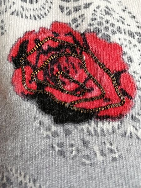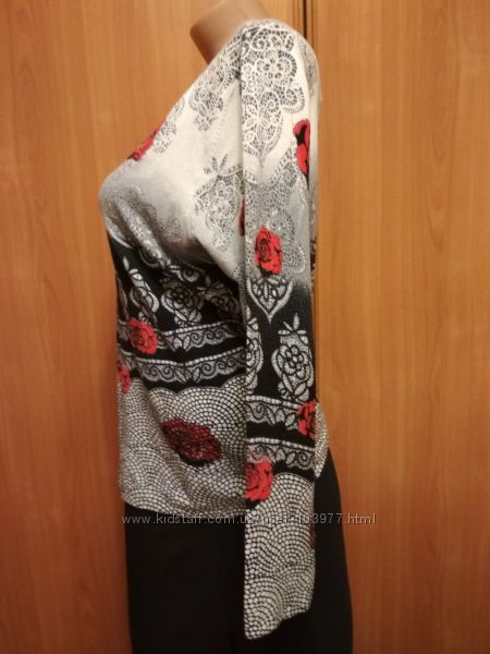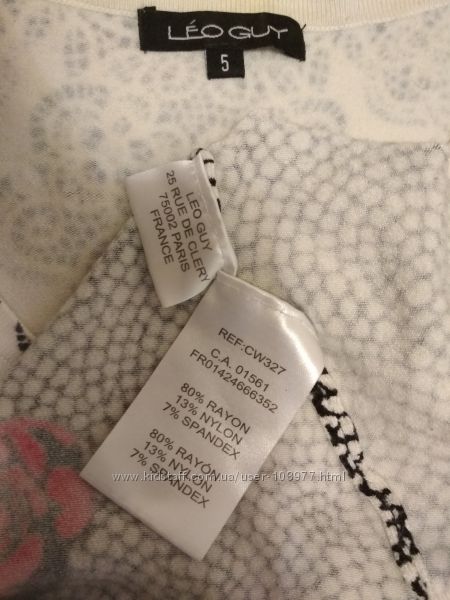 Супер модная элегантная кофточка от элитного французского бренда Leo Guy. Оригинал. Состояние: новая, без бирок. Размер: производителя-5, европейский- 44. Полу обхват груди-52 см, плечи-40 см, длина рукава-47 см, длина -59 см, ширина по низу-52 см. Состав: 80% rayon 13% nylon, 7% spandex. Цвет: серо-бело-черный. Марка Leo Guy, Paris, France. Украшена красными розочками, лепестки которых вышиты темно-золотым люрексом. Размеры модели: 99-78-105, рост 169.Оплата на карту Приват Банка или наличными при самовывозе.