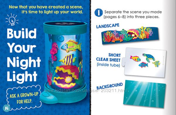 Детки больше не будут бояться спать сами с собственноручно сделанным ночником! В этом наборе 4 фона, 5 ландшафтов и больше 50 прозрачных изображений для создания 3д сцен, что будут светиться ночью! Также есть 3 диска с проекциями звезд, рыб и облаков.
