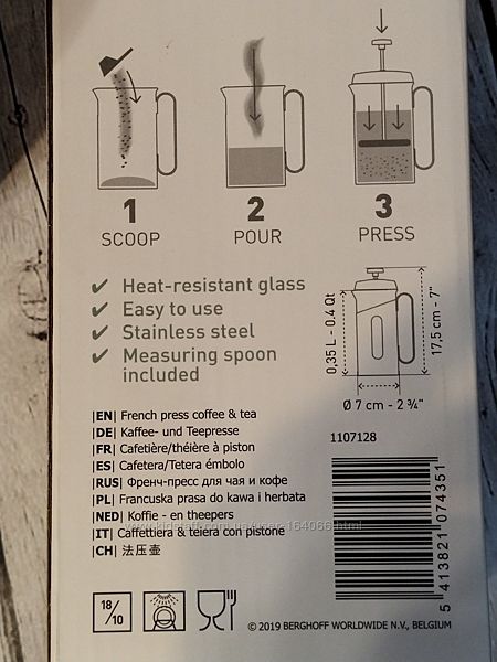 Подробное описание: Френч-пресс Berghoff 350мл,800мл,1000мл,1107128,1107130,1107131