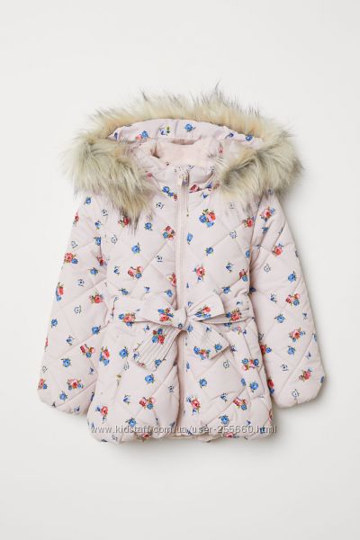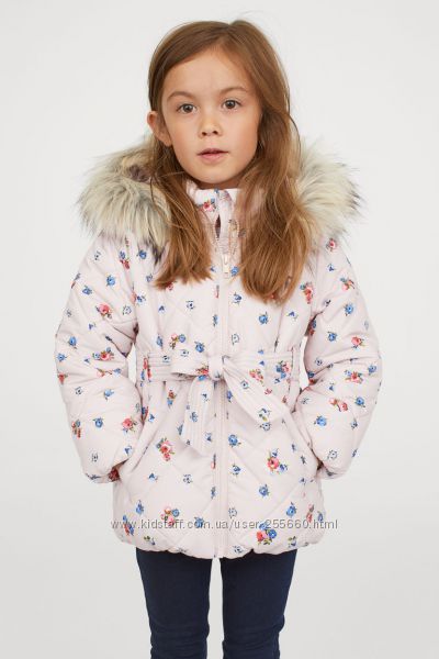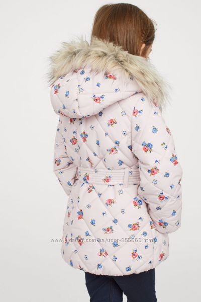 Стильна стьобана курточка злегка рожевого кольору в квіточку з пояском із тканини з просоченням.