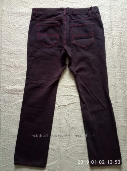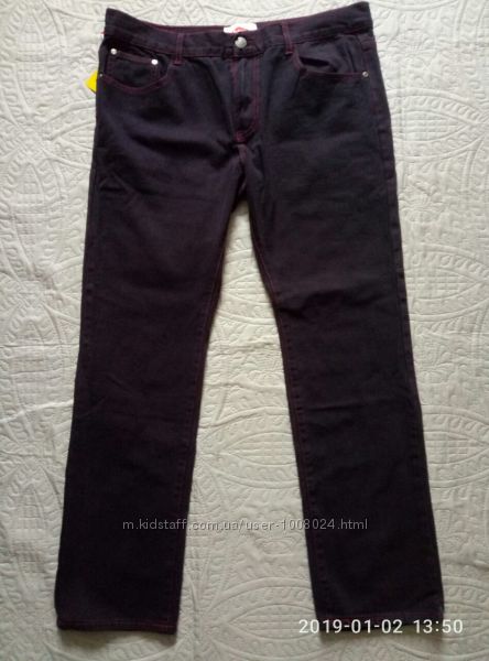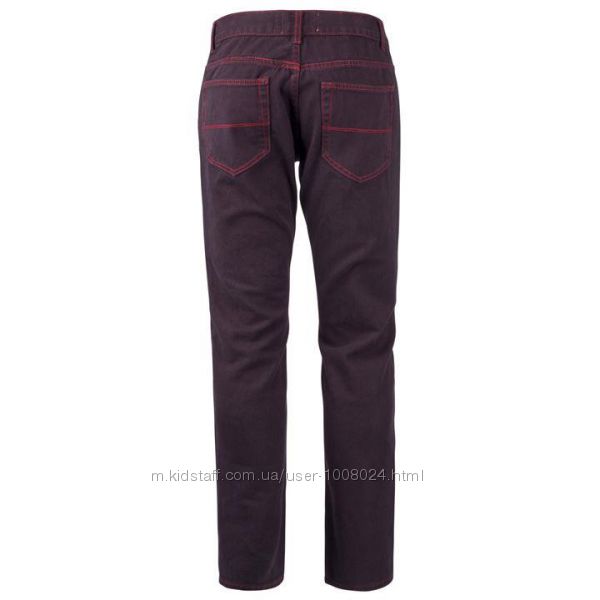 Характеристики: - Цвет темный баклажан с контрастными строчками красного цвета. - Джинс плотный, подойдет для холодного времени года. - Классический прямой крой, не широкие внизу. - Смотрятся красиво и очень стильно.