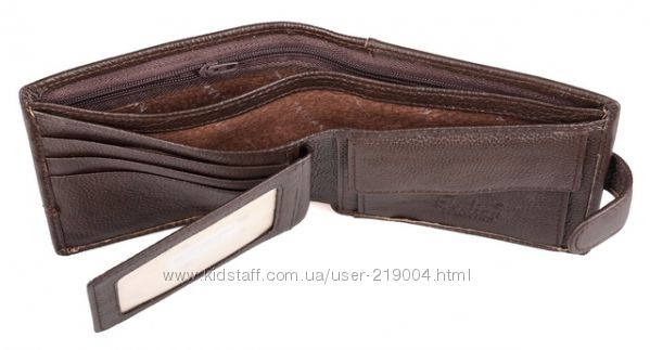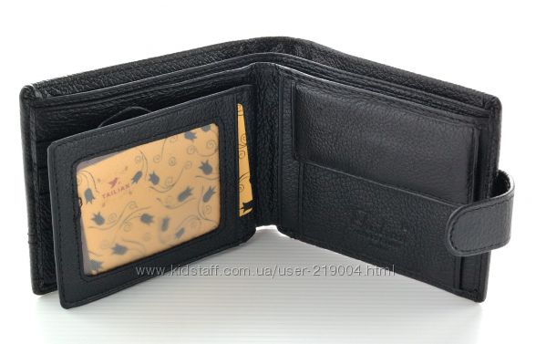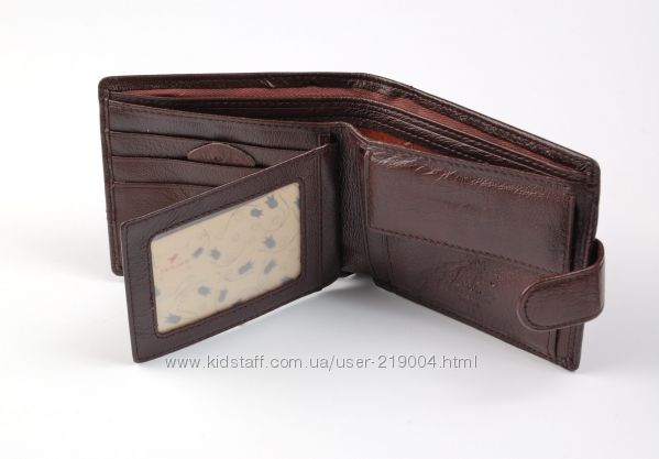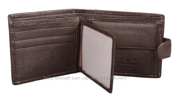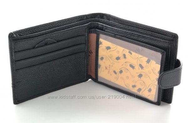 Мужской кожаный кошелек. Портмоне с 3 отделениями под банкноты (1 змейка), внутри – отделение для монет, 2 больших кармана, 3 кармана для визиток, откидной правник с 2 прозрачными карманами. Закрывается на клапан. Размер (см) 11,5*9,5. Поставляется в коробке.