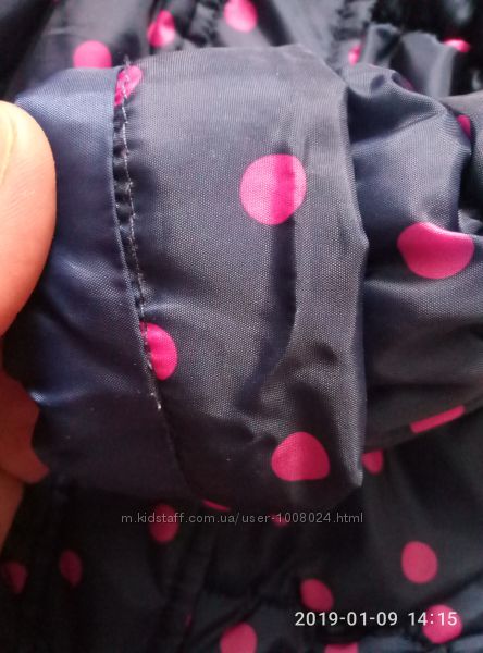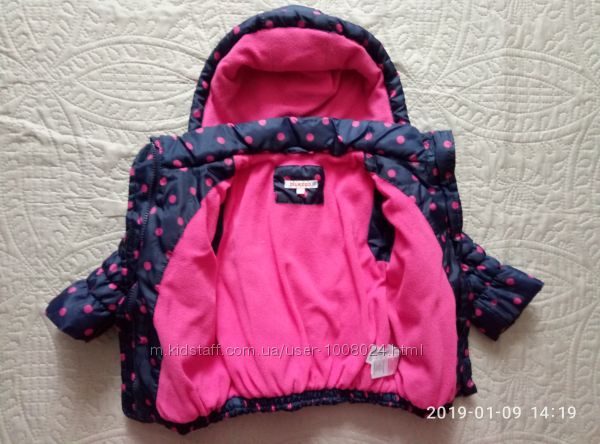 Характеристики: Внешний материал - плотная плащевка. Утеплитель средней плотности по всей куртке и дополнительно флис (кроме рукавов). Приталенная модель, хорошо садится по фигуре за счёт резинки. Насыщенный синий цвет с розовыми горошинами. Капюшон не снимается. Застегивается на молнию и липучки. Подойдет на прохладную весну.