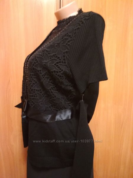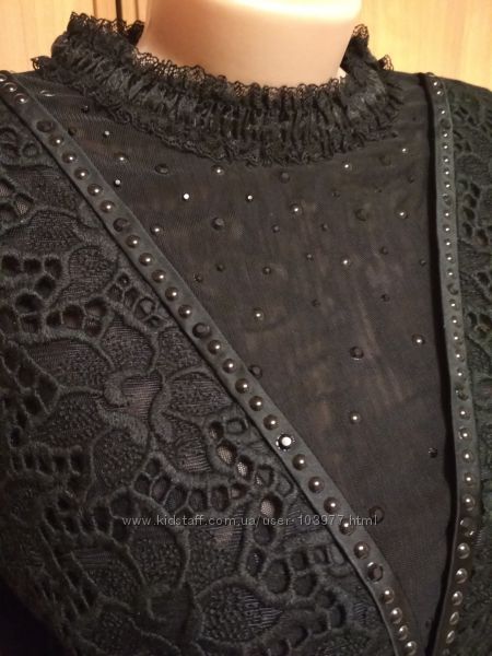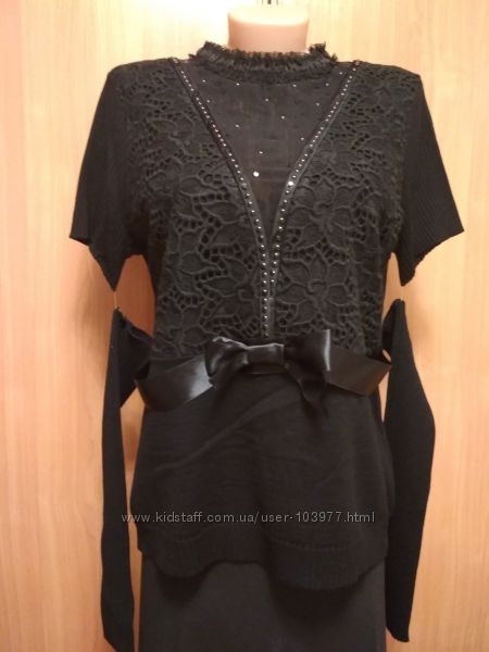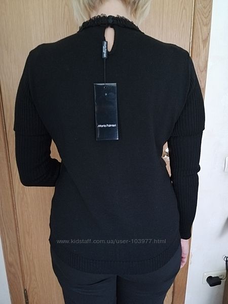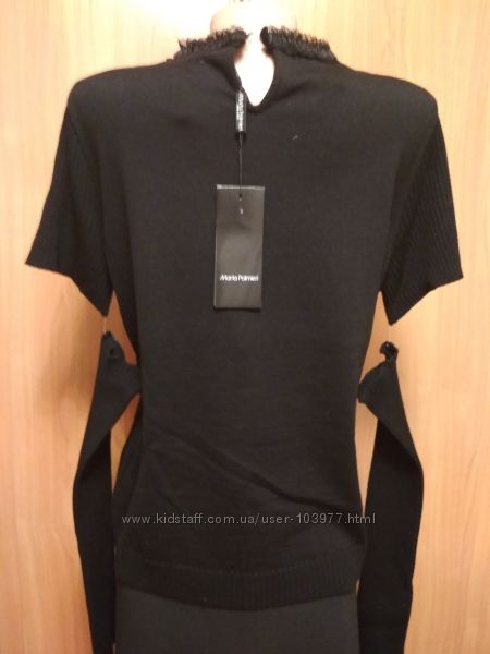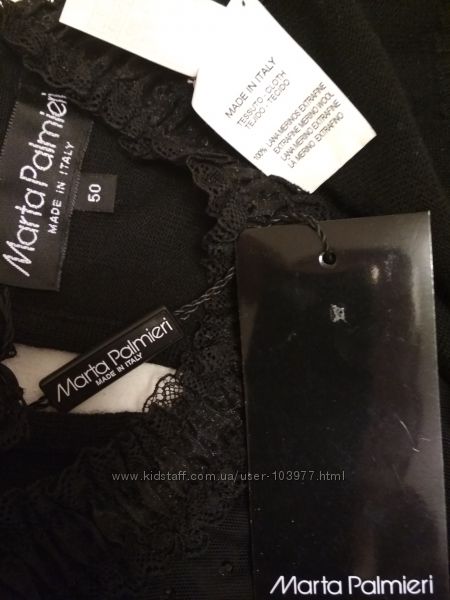 Супер модная элегантная кофточка от знаменитого итальянского бренда Marta Palmieri. Размер 52 . Состояние: новая, с бирками. Размер: производителя-50. Полу охват груди-53 см, плечи-39 см, длина рукава: короткий+съемный, длина кофты-62 см, ширина по низу-53 см. Цвет: черный. Состав: 100% шерсть мериноса . На груди выполнен разрез, обрамленный черными стразами. Внутри разреза вуаль со стразами. Воротничок выполнен из присборенной вуали, застегивается сзади на две пуговички. По талии спереди черный атласный поясок с закрепленным бантиком посередине. Низ кофточки на резинке. Короткий рукав-резинка. Если нужны полноценные рукава, то они тоже есть, но надеваются отдельно. Оплата на карту Приват Банка или наличными при самовывозе.Доставка: Самовывоз, Новая почта.