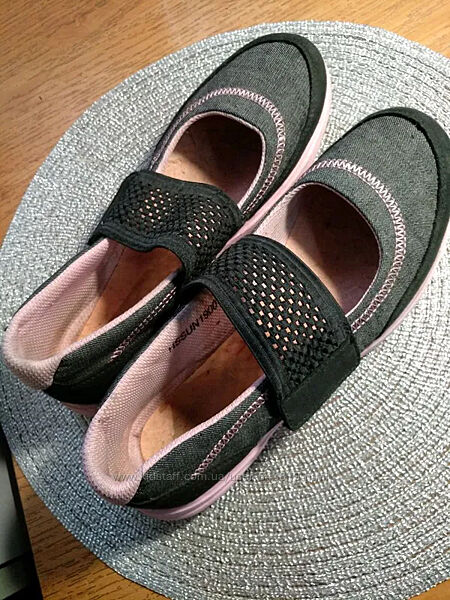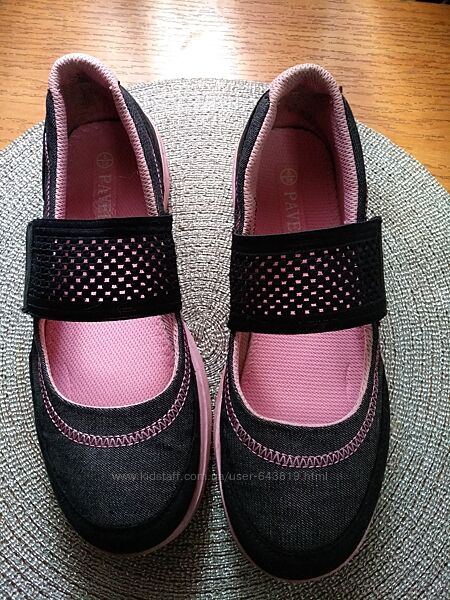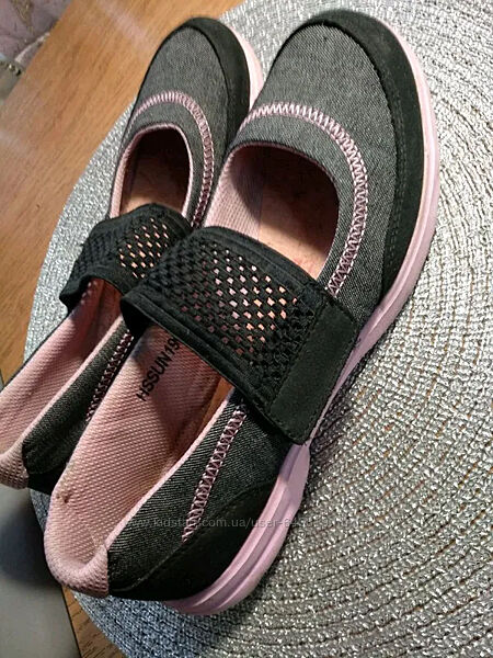 Очень легкие и удобные летние тканевые туфли-мокасины, типа спортивных.Впереди перепонка с сеточки-резинки на липучке, для удобства в носке.