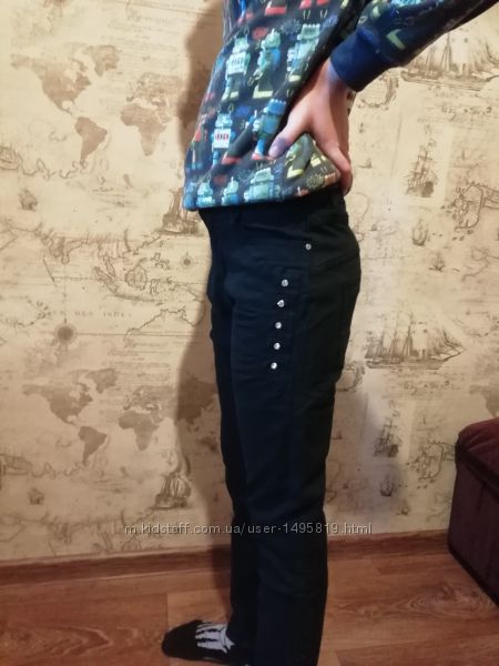 Джинсы классические черного цвета для девочек от венгерской фирмы Dream Girl.Модель стильная, практичная, удобная, с карманами. Перед декорирован стразиками - очень красиво!!! Отлично подойдет для школы и просто прогулок. Коттон стрейчевый.Верх - молния и пуговица.