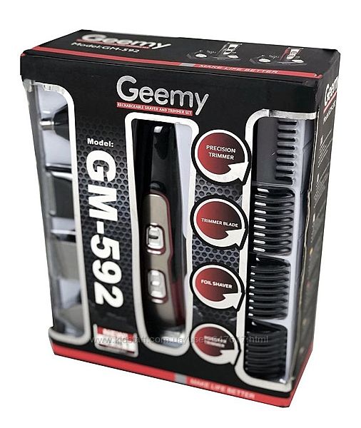 Аккумуляторная машинка для стрижки Geemy Gm -592, 10 в 1 (набор для стрижки волос и бороды)Универсальный, надежный и высокотехнологичный триммер машинка Gemei 592, позволит вам с комфортом совершать уход за волосяным покровом на Вашем лице. Простота ухода за триммером обеспечивает максимальный уровень гигиеничности, а эргономичность и небольшие габариты прибора дает возможность брать его даже в поездки, не опасаясь за отсутствие электричества. Триммер сделает все для того, чтобы Вы смогли подчеркнуть свою оригинальность