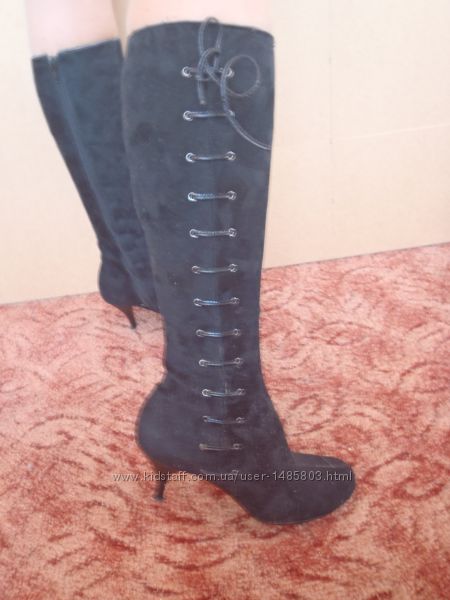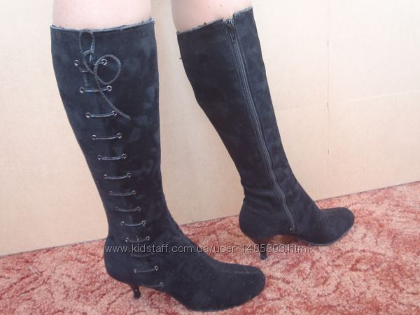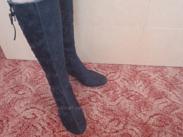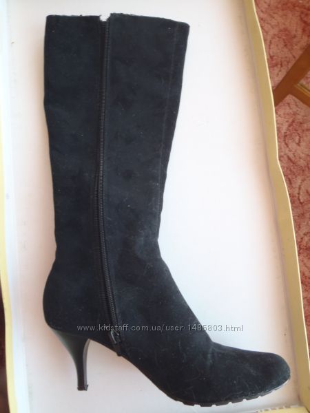 Демисезонные сапоги в отличном состоянии, размер 36 полномерный, подойдут на стопу 23.5см - 23.7см . Высота каблука 6.8см. Удобная колодка, каблук не чувствуется, родные набойки целы и ещё прилагаются новые запасные набойки, подошва в отличном состоянии, не вытерта. Из недостатков: есть пару царапин на каждом каблуке, но они расположены в нижней части каблука и поэтому не заметны, при желании их легко можно закрасить чем то чёрным.Объём ноги модели по линии верха голенища сапога 35см.Материал верха: искусственная замша.