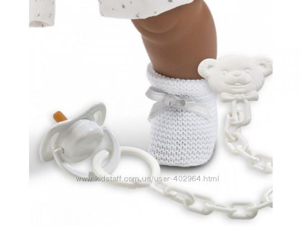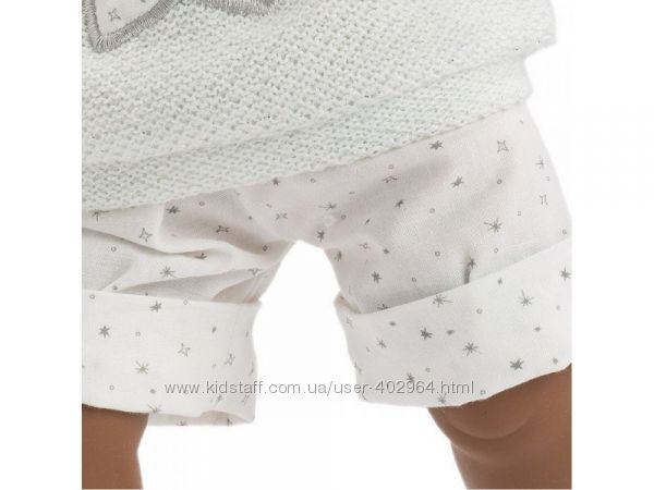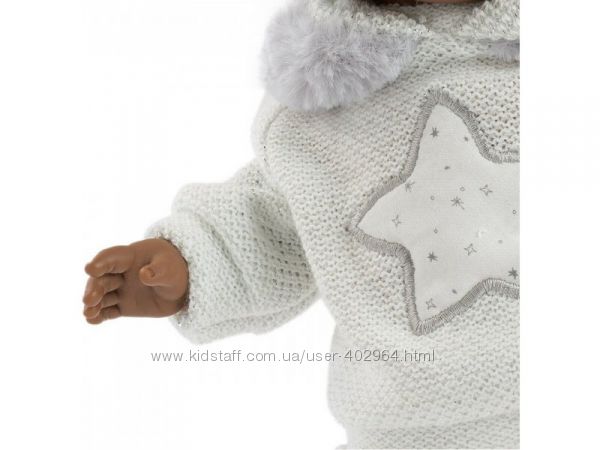 Кукла Sirham 38615 размером 38 см и выполнена из нежного, приятного винила. У него мягкий живот, заполненный мягким наполнителем. У куклы есть соска, при вынимании которой она плачет и говорит «мама, папа». У Сирхама темная кожа и глаза. Сирхам одет в белый трикотажный свитерок с вышитой звездой и капюшоном, обшитым серым плюшем, белые, по колено, шорты в серебряных звездах. В комплект также входят белая шапка и носки, украшенные белыми бантиками. Кукла упакована в элегантную картонную коробку, которая идеально подходит для подарка.Характеристики