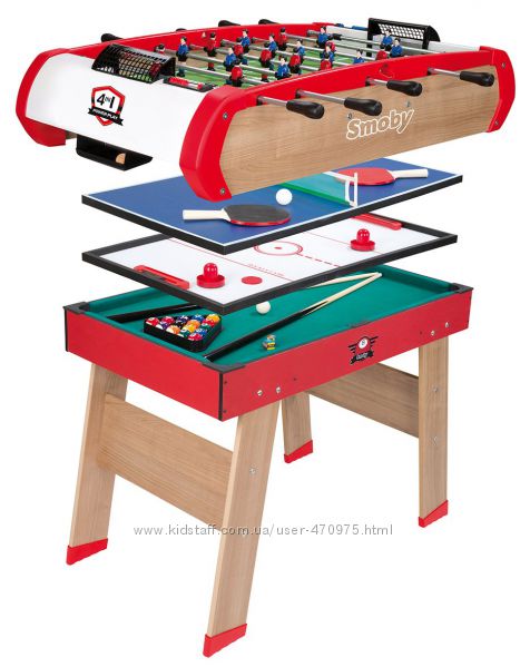 Деревянный полупрофессиональный стол Smoby Power Play 4 в 1 имеет четыре сменные игровые поверхности, поэтому позволяет играть в четыре разные игры: настольный футбол, настольный теннис, настольный хоккей и бильярд. В комплекте есть все необходимые аксессуары для игры. Конструкция стола позволяет легко переключаться с одной игры на другую. Вы можете организовать дома настоящий турнир с семьей или друзьями!