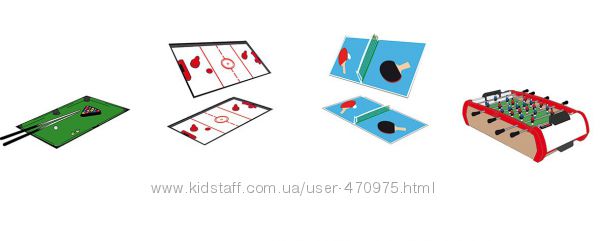 В комплекте: четыре сменные игровые поверхности для игры в футбол, настольный теннис, настольный хоккей и бильярд, а также аксессуары для игры