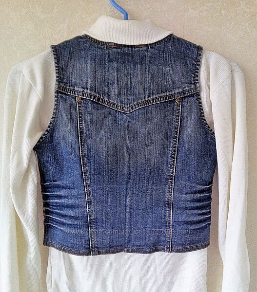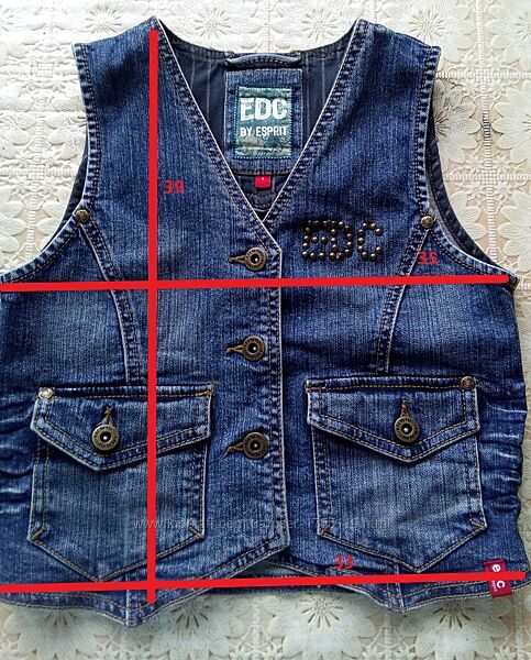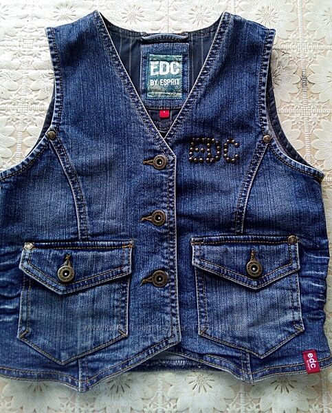 Цвет синий. Джинс качественный, металлические пуговицы и аппликация EDS , два кармана. Жилетка в отличном состоянии.Замеры: