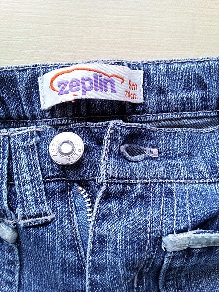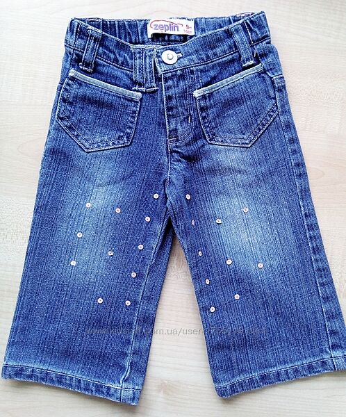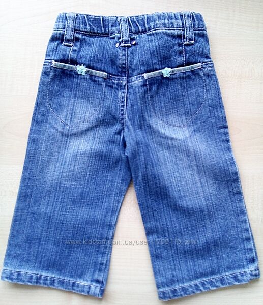 Джинсы на девочку, возраст 9 мес. , рост 74 см. Пояс на широкой резинке. Застегиваются на молнию, по два кармашка спереди и сзади, украшены пайетками. Хлопок 100%. В очень хорошем состоянии.Замеры см. на фото.