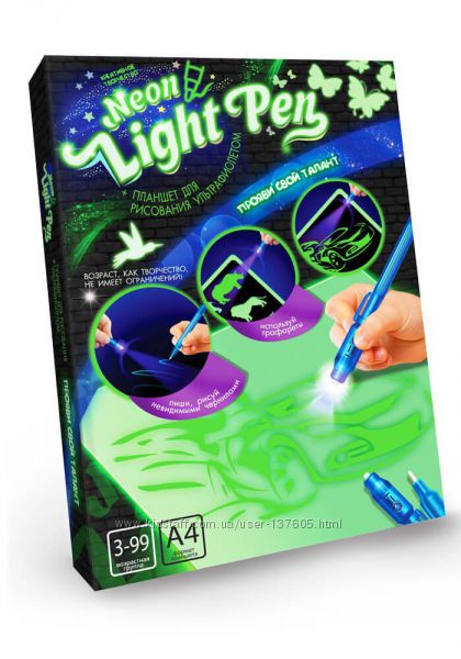Набор Neon Light pen NLP-01 Данко-тойсВам достаточно лишь взять планшет и «волшебную ручку». На планшете лучше всего рисовать в темноте, с помощью предлагаемых трафаретов, либо используя собственную фантазию и креативное мышление. Так же, «волшебная ручка» пишет специальными невидимыми глазу чернилами. Увидеть написанное можно лишь посветив ультрафиолетом!Покорите волшебный свет и Вы выйдете за привычные границы творчества, подниметесь на новый уровень мастерства и создадите яркий шедевр любой сложности.