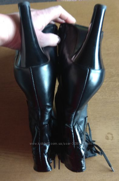 Демісезонні напівчобітки 39 р. (25,5 см устілка) з НАТУРАЛЬНОЇ ШКІРИ. З боків вставки "Полум´я" з натурального лаку. На шнурівці. Всередині утеплені демісезонною байкою.Без дефектів. Тільки на підошві сліди від носіння, але мало одягались, так як перестала ходити на високих каблуках.