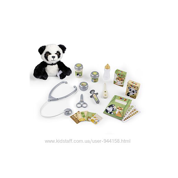 Набор дополнен аксессуарами: шприц с механическим действием, термометр с механическим действием, 2 бутылки, стетоскоп, ножницы, бутылочка для кормления, повязка на липучке на лапку, 2 коробки для смеси, медицинская книжка для персонализации и набор пластырей.