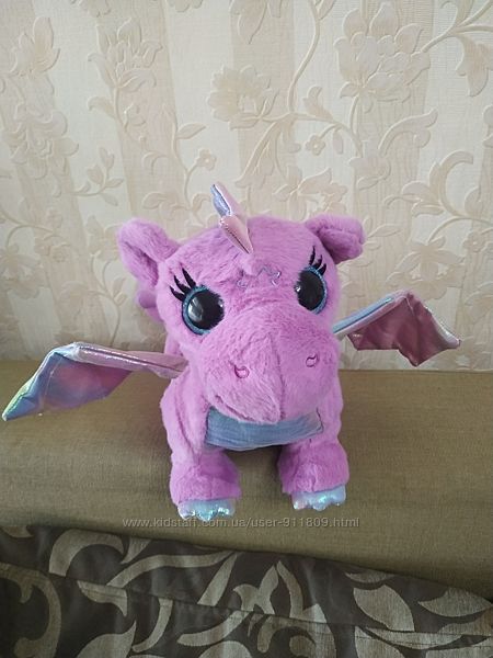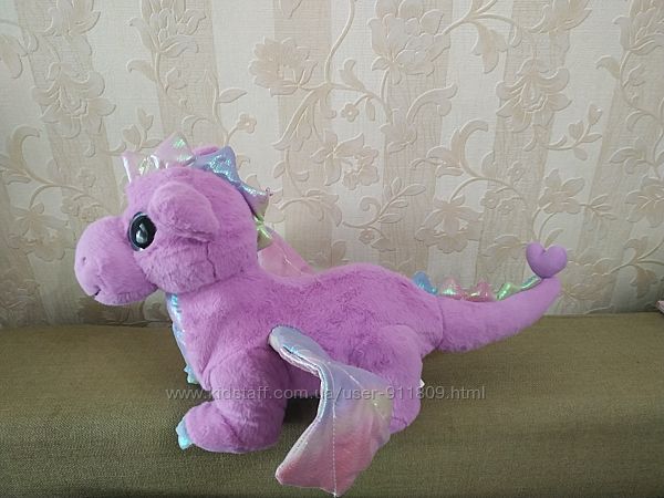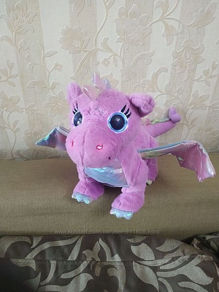 Замечательная новинка от компании Zapf Creation, мягкая игрушка - функциональный дракон! У него плюшевое сиренево-розовое тело, перламутровые крылья, рожки и шипы на хвосте, а также добрые и выразительные голубые глазки. При нажатии на ушко у дракона светятся глазки и ноздри, издает звуки, фыркает, рычит. Если коснуться звёздочки на лбу волшебной палочкой ( нет в комплекте, работает от любого магнита) начинает идти, сил хватает, чтобы везти на себе Беби Берна, остановить его нужно вторым касанием. Все функции выполняет, состояние отличное, пересылаю по Украине любой почтой