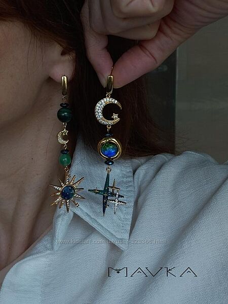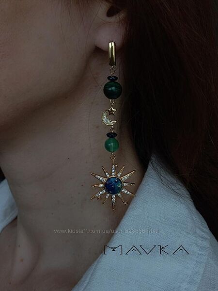 Асиметричні сережки "Космос"Намистина лемпворк, що світиться, малахіт, агат, преміальна фурнітура інкрустована фіанітами.