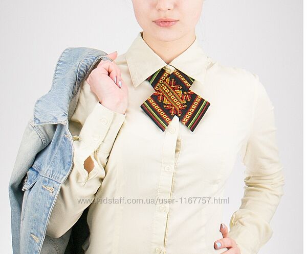 Крос-краватка або краватка-бант Чарівниця виготовлена з сатину, оздоблений стилізованою українською вишивкою. Декоративною особливістю виробу є стилізована вишивка, що розміщена по центру кроса (симетрично на обох деталях краватки). Краватка має застібку і регулятор, що дає змогу дуже швидкого і простого вдягання, тому аксесуар не потребує специфічних навичок зав´язування !Крос-краватка Чарівниця одинаково пасуватиме як під офісне вбрання на кожен день, так і на презентації або навіть вечірки.