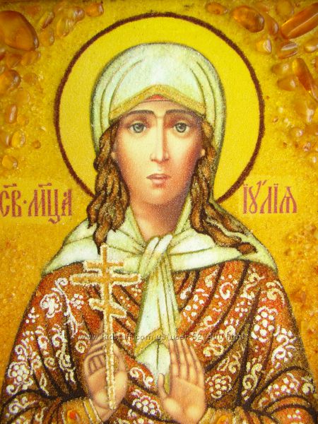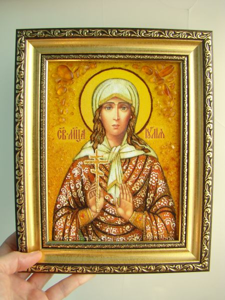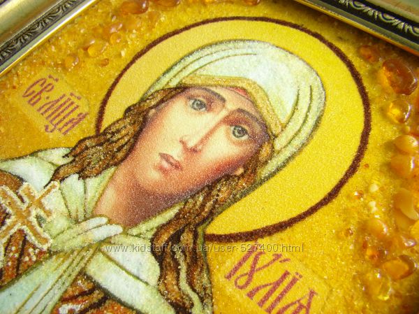 Подарите близкому человеку (бабушке, маме, доченьке, крестнице) икону из янтаря - это память, оберег и солнечное тепло на долгие годы. Икона из янтаря - это особое сочетание тщательной ручной работы и искристого самоцвета, подаренного людям землей, солнцем и морем - янтаря. Такая икона будет дарить Вам и Вашему дому теплый свет благословения. Особенно это чувствуется, когда на икону попадает солнечный свет, она озаряется внутренним светом и теплом, излучая его в окружающее пространство.Именная икона из янтаря ручной работы "Святая Юлия".