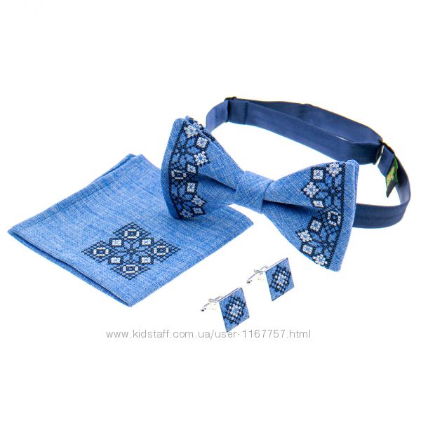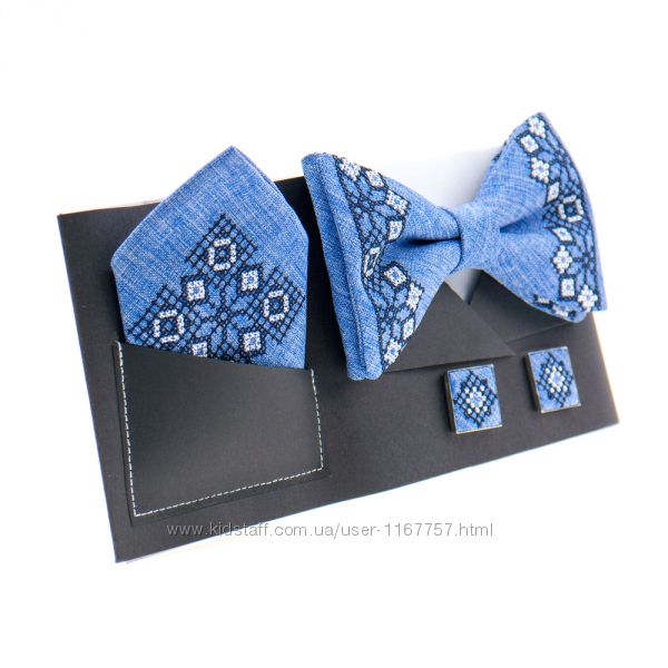 Вишитий набір №858 складається із вишитого метелика, вишитої хустинки та вишитих запонок. Матеріал виробів – костюмна тканина блакитно-волошкового кольору. Вишиті запонки мають металеву основу з платформою 2х2 см, прикрашену вишитою тканиною в колір.Комплект запакований в ексклюзивну фірмову упаковку ручної роботи. Такий вишитий набір - це гарний і оригінальний подарунок для ділової людини.