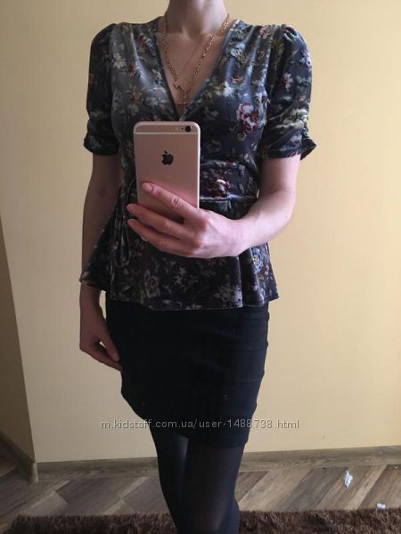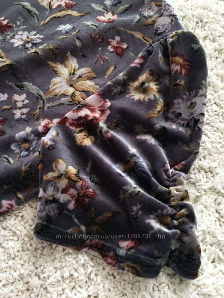 Велюрова блузка на запах, в квітковий принт, марки «New look». З внутрішньої сторони кофточка защипається ще на гудзик. Ззовні - зав‘язується на шнурочок. Основний колір - сірий.В наявності розмір