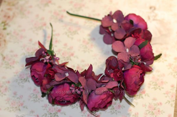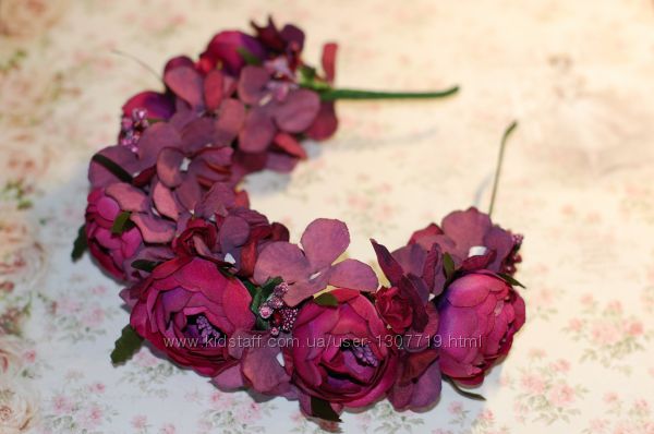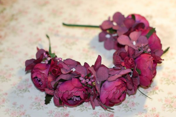 Фантастический обруч из пионов и гортензии цвета марсала. Цветочки тканевые. Объемный, но легкий. Основа - обруч-металл.В таком ярком ободке Вы не останетесь незамеченной!