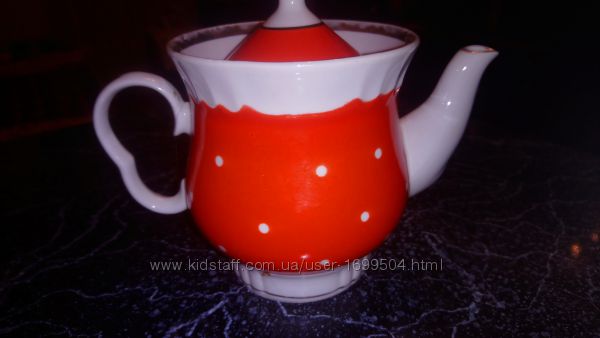 Красивый красный чайник в горох с золотистыми вставками.