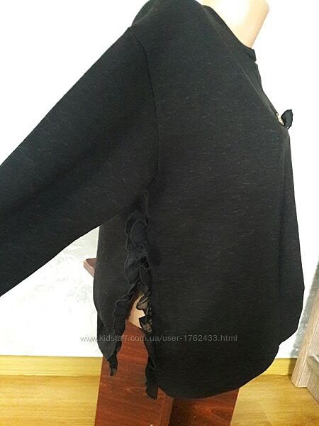 Утепленный свитшот размер S, идет примерно на 46-48, цвет черный с фрагментами серой нитки. С правой стороны разрез с рюшами. Длинна-58, ширина-53, рукав-51,5.Другие объявления продавца