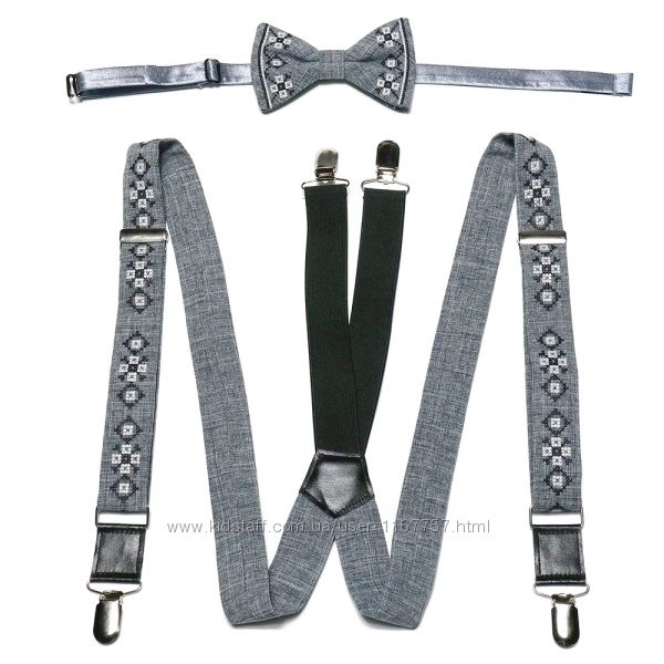 Вишитий набір складається з вишитих підтяжок та вишитого метелика. Матеріал виробів – костюмна тканина світло-сірого кольору та вставки зі шкіри. Метелик має зручну застібку та регулятор довжини, що дуже спрощує життя своєму господарю, особливо в термінових ситуаціях. Довжина підтяжок регулюється за допомогою регуляторів та становить приблизно 120 см, ширина – 3 см. Металева фурнітура гарної якості та має надійну фіксацію.Вишитий набір запакований в фірмову упаковку ручної роботи, виготовлену з чорного дизайнерського картону.