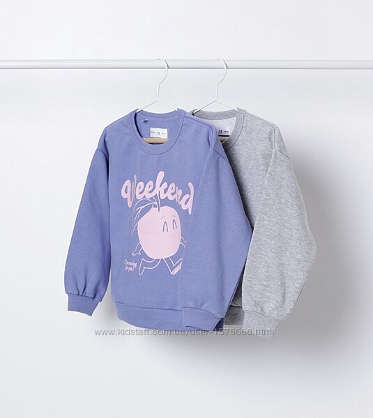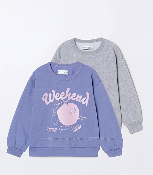 В наявності світшоти для дівчинки іспанського бренду Lefties. В наборі два світшоти, сірий однотонний та бузковий з принтом, з круглим вирізом, виготовлені з м´якої, приємної на дотик тканини. Комір, манжети на рукавах та на талії виготовлені з еластичної тканини в рубчик. Тканина має м´яку начісну внутрішню частину, що забезпечує відчуття комфорту та тепла для дитини. Склад тканини: 3% еластан, 39% поліестр, 58% бавовнаВ наявності розмір 7/8 років, на зріст 118-128 см, згідно розмірної таблиці виробника.