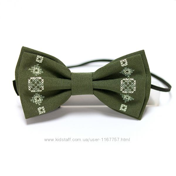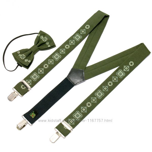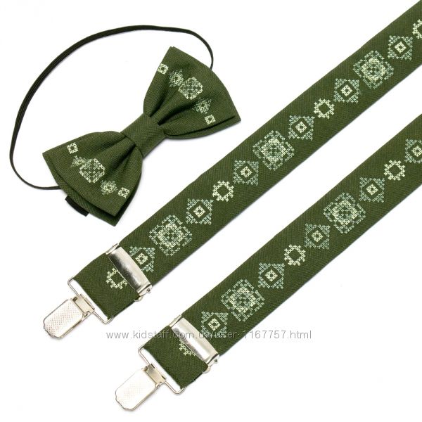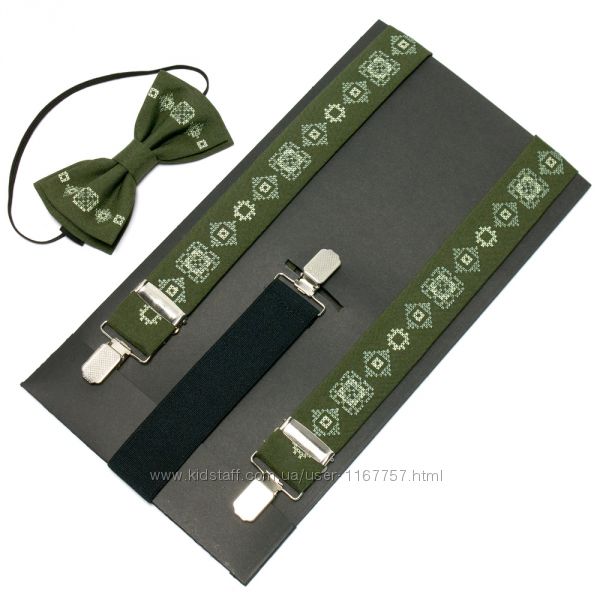 Дитячий вишитий набір складається з дитячих вишитих підтяжок і вишитого метелика. Матеріал виробів - костюмна тканина зеленого кольору. Довжина підтяжок регулюється за допомогою металевих регуляторів та становить приблизно 77 см, ширина 3 см. Кріплення метелика здійснюється на резинці для швидкого одягання на вашого непосидючого.Комплект запакований в фірмову упаковку ручної роботи з дизайнерського картону