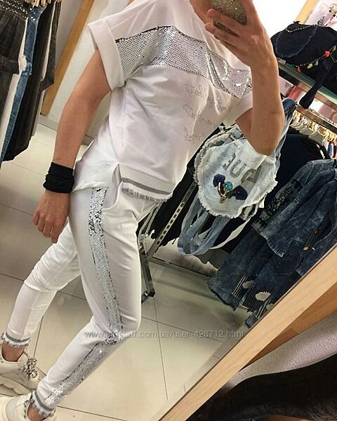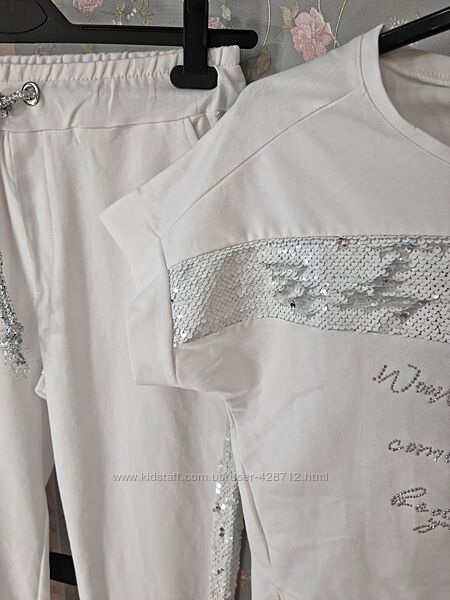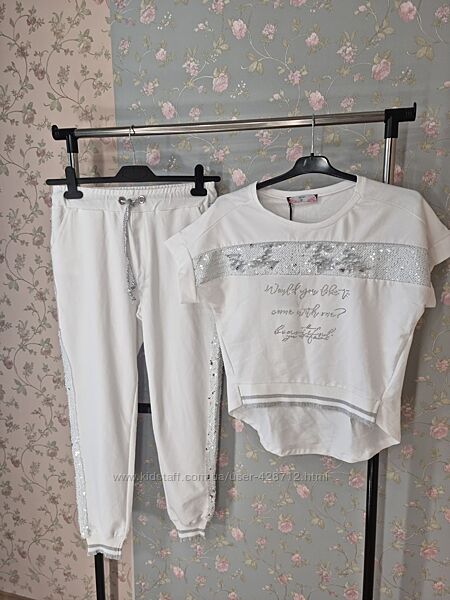 Состав 96% соттон В наличии Цвет белый размер ХЛ.Замеры Л футболка ширина под руками 56 см длина спереди 58 см длина сзади 68 см штаны ширина в бедрах 56 см длина 98 см шаг 71 см