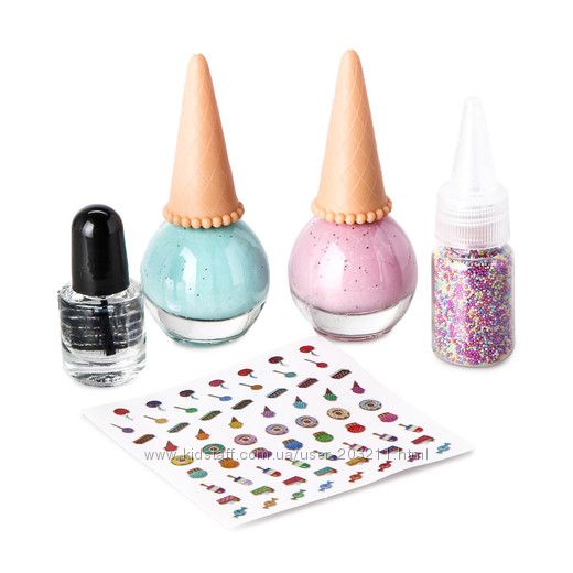 В наборе 2 лака с ароматом ванили и клубники (после высыхания проявляется запах), защитное покрытие (top coat), микро бусины, 65 наклеек для ногтей, легкие инструкции. Ингредиенты профессионального качества.