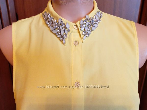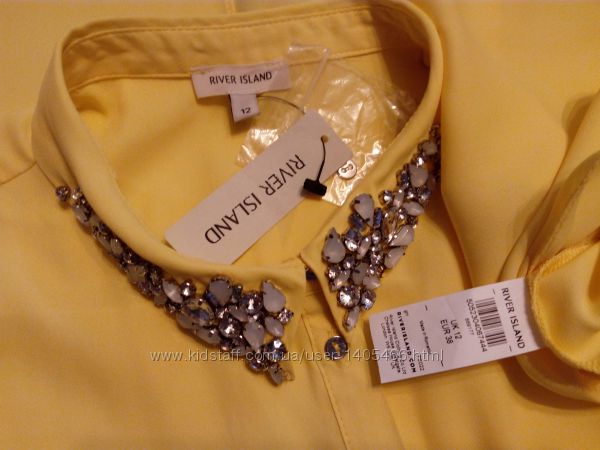 Фирменная яркая блузка River Island. Воротничок расшит камнями, оригинальный крой спинки. До низа застегивается на пуговки, по бокам разрезы, зад немного удлинен. Размер: 12 евро, наш 46 р., см. замеры.Цвет: желтый.