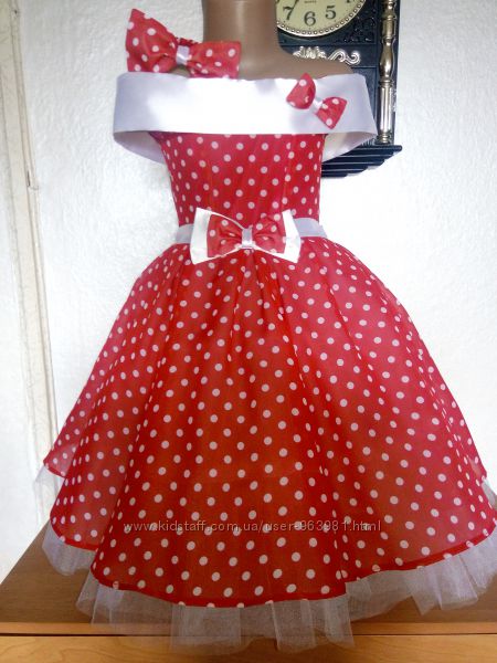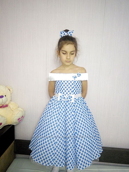 Пышное платье в ретро стиле. Регулируется корсетной утяжкой на спинке. Юбка платья состоит из трех фатиновых юбок, подкладка. Платье не нуждается в дополнительном подъюбнике, само по себе очень пышное. К платью можно отдельно заказать бант на голову на заколке или резинке для гульки, либо повязку солоха. Так же перчатки- митенки.Размер 30