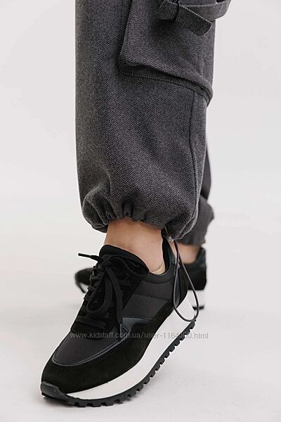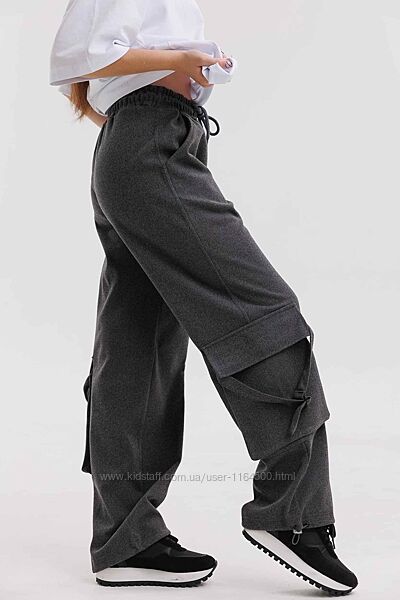 Штани карго сірого кольору для дівчинки підлітка. Тканина кашемір, чудово підійде на осінь-зиму. У поясі резинка і шнурок, що стягує. Знизу на штанях є куліска - штани можуть стягуватися.Заміри: