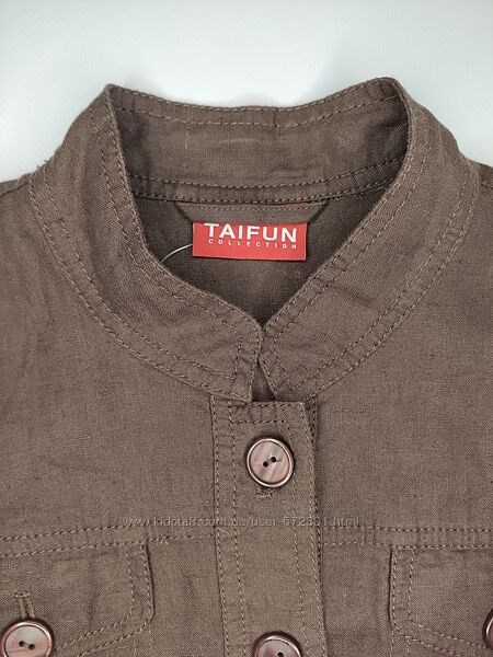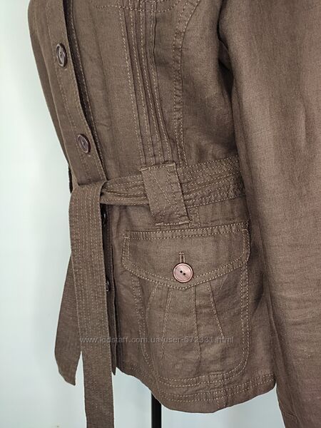 Тонкий, без подкладки. Цвет насыщенный коричневый. Крой приталенный. Карманы функциональные. Есть запасная пуговка. Замеры:Плечи 43 см