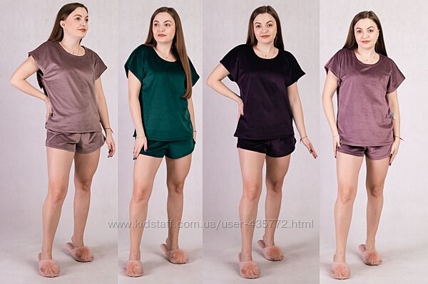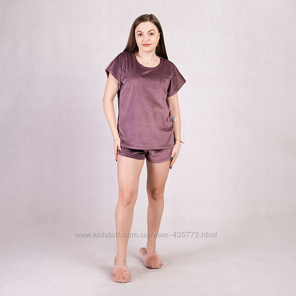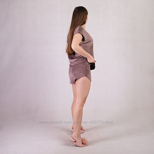 фото 4,5,6,7 Комплект жіночий з полотна велюр(оксамит) плюш. Шорти з кишенями та футболка. Стильна, м´якенька й приємна на дотик. Проста в догляді, чудово зберігає форму.