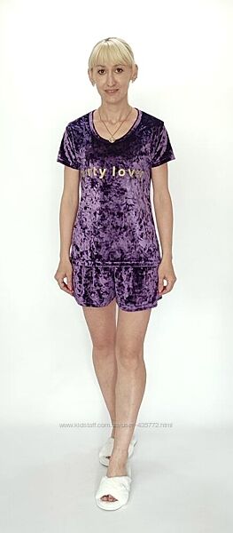 фото 8,9,10 Костюм із мармурововго велюру, футболка вільного покрою прикрашена красивим блискучим написом ( якісний шовкотрафаретний друк) та шорти на посадці трішки вище середньої. Красива та зручна модель із велюрового полотна стане відмінним подарунком як для себе так і для близької людини. Не мнеться - та не потребує особливого догляду.