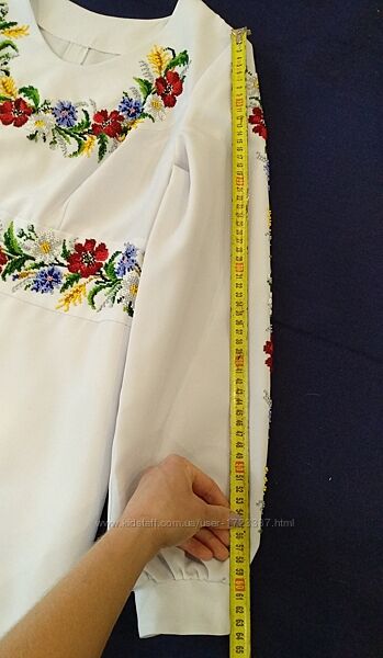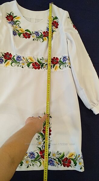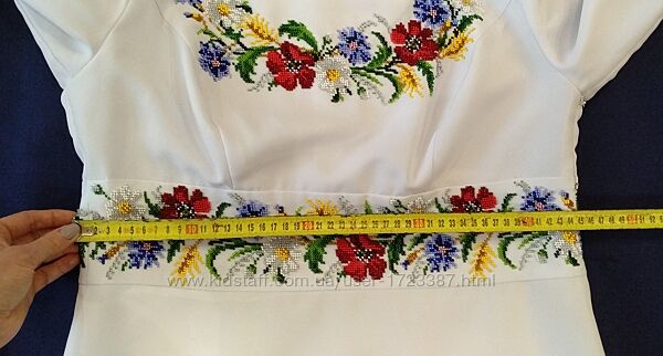 Доброго дня. Бажаєте виглядати прекрасно, розкішно, чарівно, ніжно та надзвичайно вишукано? Дозвольте Вам запропонувати красиве вишите плаття на габардині чеським бісером. Плаття вишивалось мною особисто дуже аккуратно, без затяжок, без вузликів та з прекрасним настроєм. Ви можете самі побачити якість вишивки на фото. Плаття шилось кравчинею на замовлення на розмір L або 48, на повногруду красуню з чашечкою бюсту 4-5 розміру, довжина його до коліна. Кого цікавлять розміри по факту або додаткові фотографії - скину фото з замірами в особисті повідомлення на вайбер/ватсапп/телеграм.Як видно на фото вишиті два рукава, горловина, пояс навкруги талії та низ плаття по усій окружності юбки, а також вишита імітована розпірка спереду. З середини пришита юбочна підкладка (підкладка під час носіння не підіймається!), хоча габардин не просвічується. Плаття було одягнуте лише двічі: на весілля та на ювілей. Скажу чесно, плаття з віночками викликало багато позитивних емоцій в гостей свята, а я почула багато компліментів захвату від української вишивки та дівочої краси.