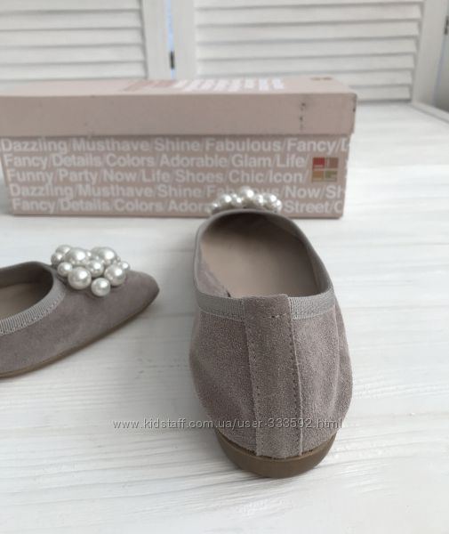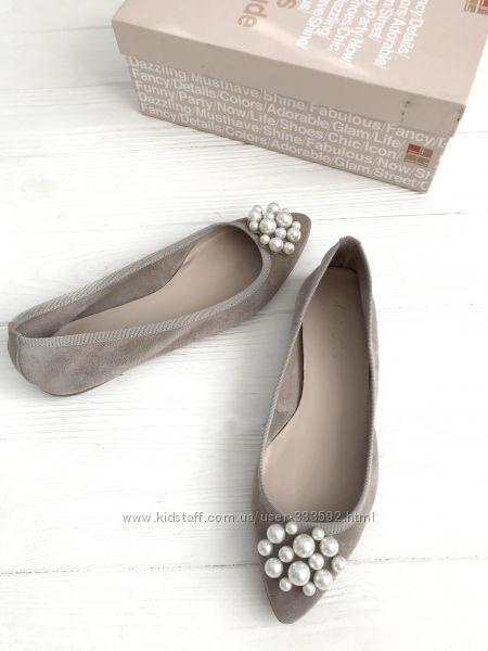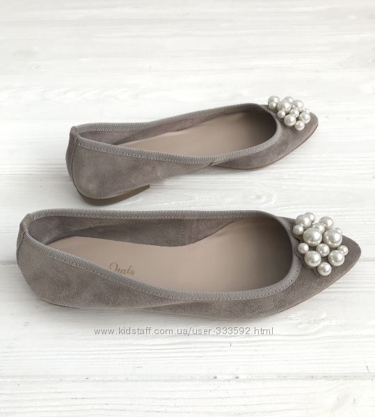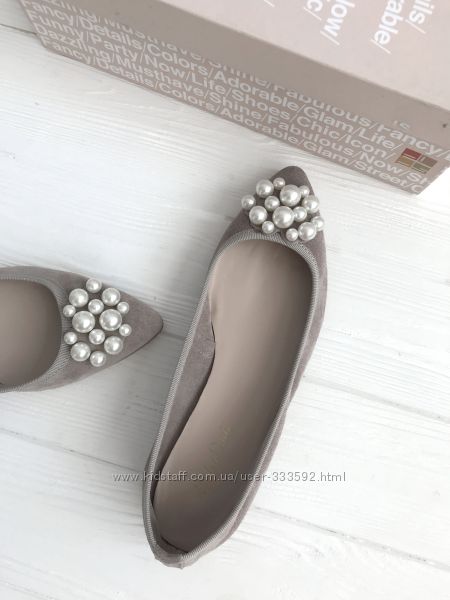 Мягчайшие остроносые замшевые балетки цвета тауп, декорированные бусинами, сделают ваш повседневный образ не только трендовым, а еще и женственным и утонченным.