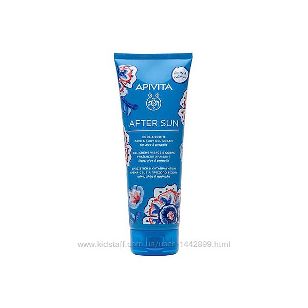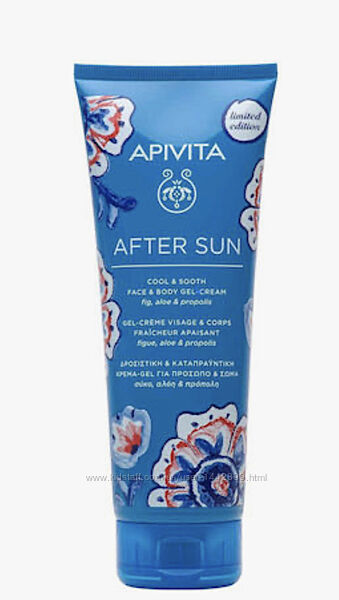 УВЛЖНЯЮЩИЙ И ОХЛЖДАЮЩИЙ КРЕМ-ГЕЛь ПОСЛЕ ЗАГАРА APIVITA AFTER SUN крем-гель после загара с ИНЖИРОМ и АЛОЭ и Прополисом, успокаивают и снимают раздражение кожи вызваное солнцем, а также увеличивают природную сопротивляемость кожи к солнечным ожогам. Увлажняет и дает ощущение свежести благодаря входящим в состав рису, алоэ, морской лаванды, огурца и миндаля.Защищает от старения и свободных радикалов благодаря экстракту прополиса, морской лаванде и настою зеленого чая. Придаёт ощущение свежести. Увлажняет и питает, успокаивает раздражения. Обеспечивает антиоксидантную защиту.