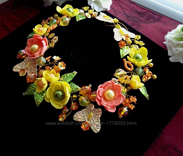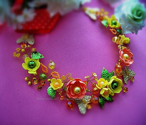 Размер 28 см - замер от первой и до последней бабочки. Крепится как полу-обруч, венок или вокруг гульки (хвостика) с помощью ленточек (которые легко снимаются ), или с помощью невидимок. Так же можно использовать украшение как колье, завязав ленточки вокруг шеи. Декоративные элементы в виде бабочек имеют голографическое напыление , и красиво переливаются при освещении. Использование в работе ярких и разных по цвету бусин создаст праздничное настроение и поможет дополнить нарядный образ маленьких модниц.