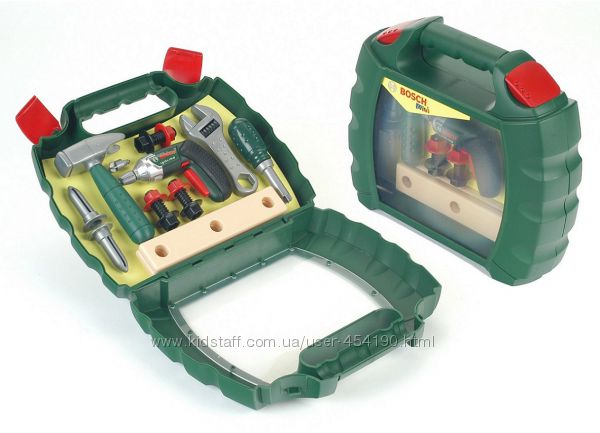 Набор инструментов с шуруповертом в кейсе BOSCH Klein 8384Набор инструментов Bosch в кейсе от немецкого производителя Klein – полный комплект всего необходимого для настоящего маленького мужчины, чтобы подражать папе в ремонтных работах. Все инструменты – точные копии фирменных аксессуаров. Упаковка – специальный кейс, отличающийся практичностью и удобством для хранения и транспортировки.