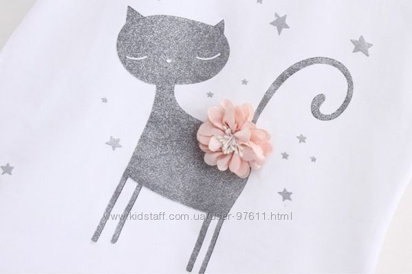 Спереду блискучий малюнок-накатка котика з об´ємною аплікацією квітки.