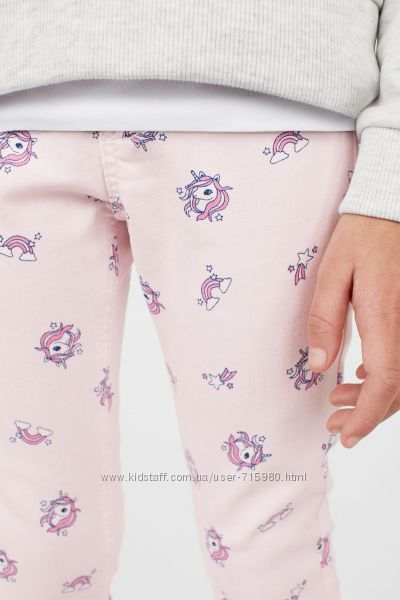 Красивые качественные треггинсы-брючки H&M для девочки с единорожками.Эластичный твил. Талия на широкой резинке. Передние карманы и молния - обманки.
