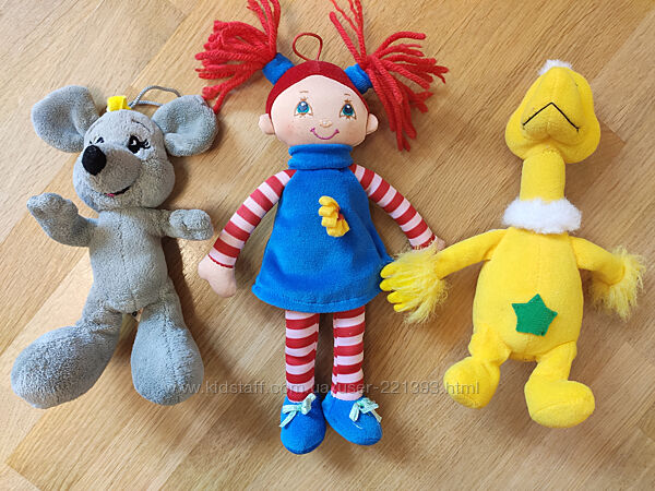 Подробное описание: Мягкие игрушки, обезьяна, корова, мышка, утка, девочка